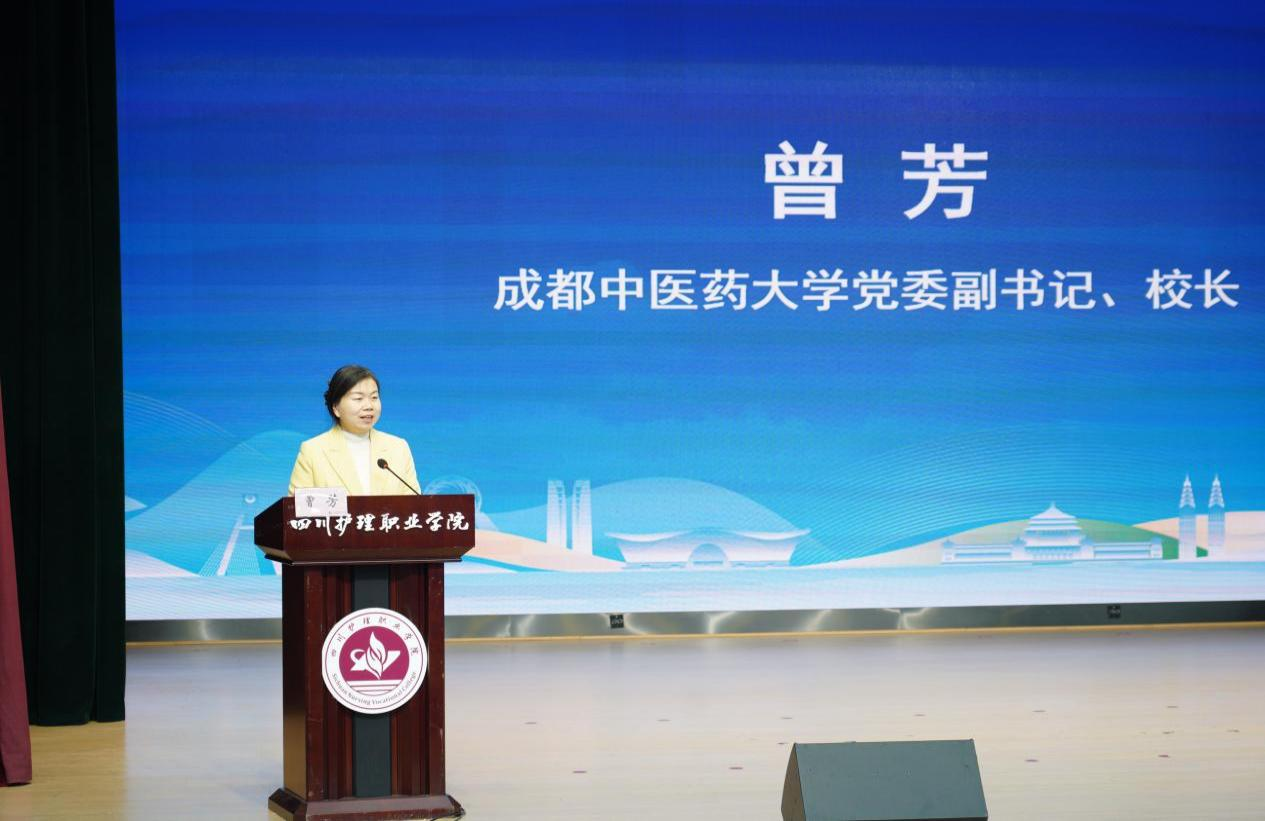 曾芳在致辞中表示,作为共同体的联合发起单位,愿携手深化产教融合、强化数智赋能,推动大健康专业与区域产业同频共进,将“共同体”打造为产业升级的“智慧引擎”,为成渝地区双城经济圈高质量发展持续注入坚实蓬勃的人才动能。