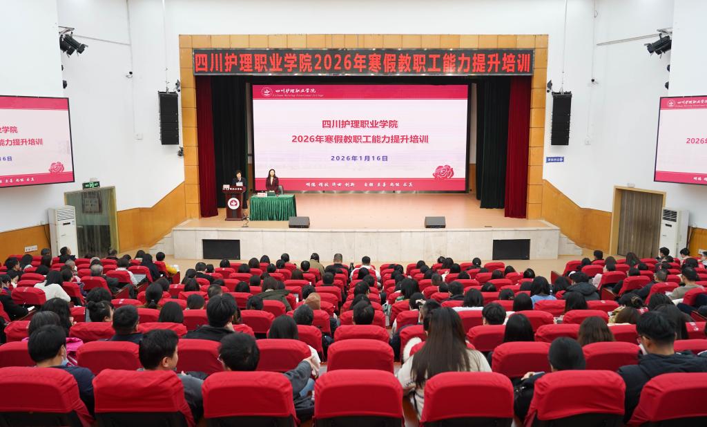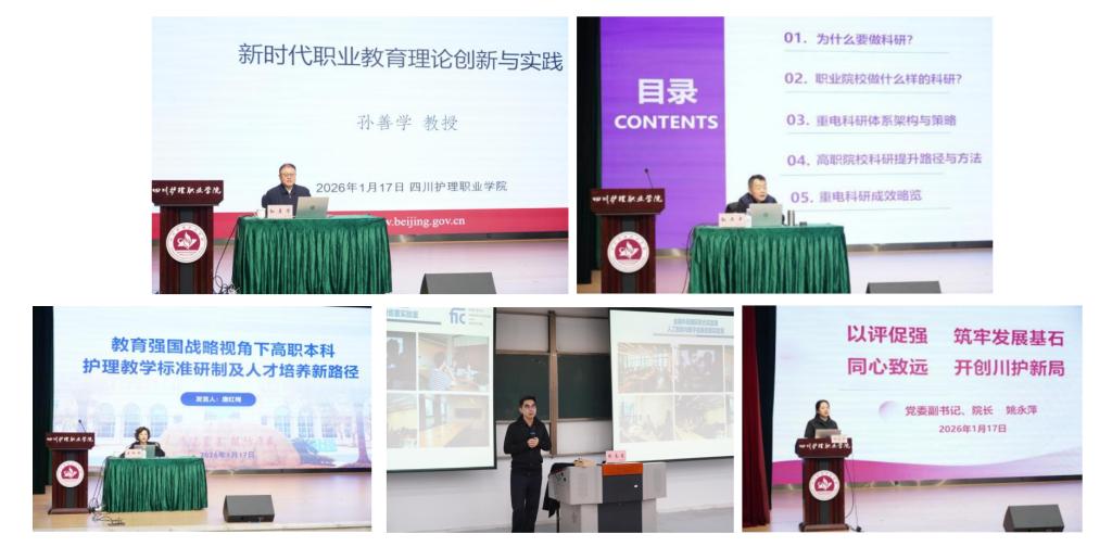 为积极主动适应智能时代变革,将人工智能技术深度融入人才培养全过程,全面提升教师教学科研能力与数字素养。北京外国语大学教授孙善学以“新时代职业教育创新理论与实践”为题,从职业教育定位阐释、理论新见、类型特征、政策发展与新实践四个方面分享,助力教职工精准把握职业教育发展脉络和时代使命。重庆电子科技职业大学原党委书记孙卫平教授以“为什么要做科研、职业院校做什么样的科研”为切入口,以重电科大科研体系架构与策略为基础,详解职业院校科研“有组织科研”的提升路径与方法;学校智慧康养产业学院专班办公室主任查聪分享“融合华西经验,扎根职教创新驱动的医药科技成果转化全生命周期管理”,为学校学科科研与长远发展注入新动能。上海健康医学院党委副书记唐红梅教授以医教协同赋能护理学教育体系-上海市应用型护理人才培养创新实践开篇,解读教育强国战略视角下高职本科护理教学标准研制及人才培养新路径,为学校护理专业发展和人才培养提出新思考。西南财经大学教授谢志龙从教学智能体的诞生背景,分享了AI赋能高校教学转型实践和多智能体课堂系统的架构设计;重庆工业职业技术大学刘蘅副处长围绕“AI+职业教育‘金课’建设”的路径创新与实战案例结构展开讲解,引导全体专职教师积极应对智能时代的教育变革。学校党委副书记、院长姚永萍围绕办学能力评价工作开展“以评促强筑牢发展基石;同心致远开创川护新局”专题讲座,提出全体人员要锚定提升学校关键办学能力,以评定向、以评促建、以评督改、提质增强,深化教学改革;智慧护理学院院长邓小利围绕智慧护理学院办学能力评价工作实施路径进行分享。
