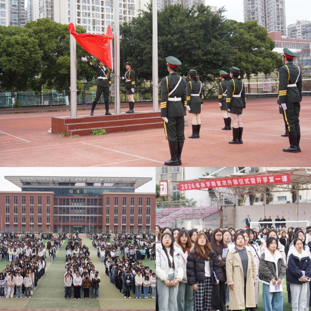 上午8时20分,伴随着雄壮的国歌声,五星红旗在两校区田径运动场冉冉升起。全体师生肃立行注目礼,以崭新的面貌、昂扬的姿态迎接新学期到来。