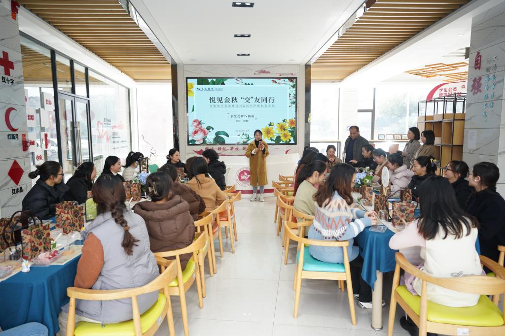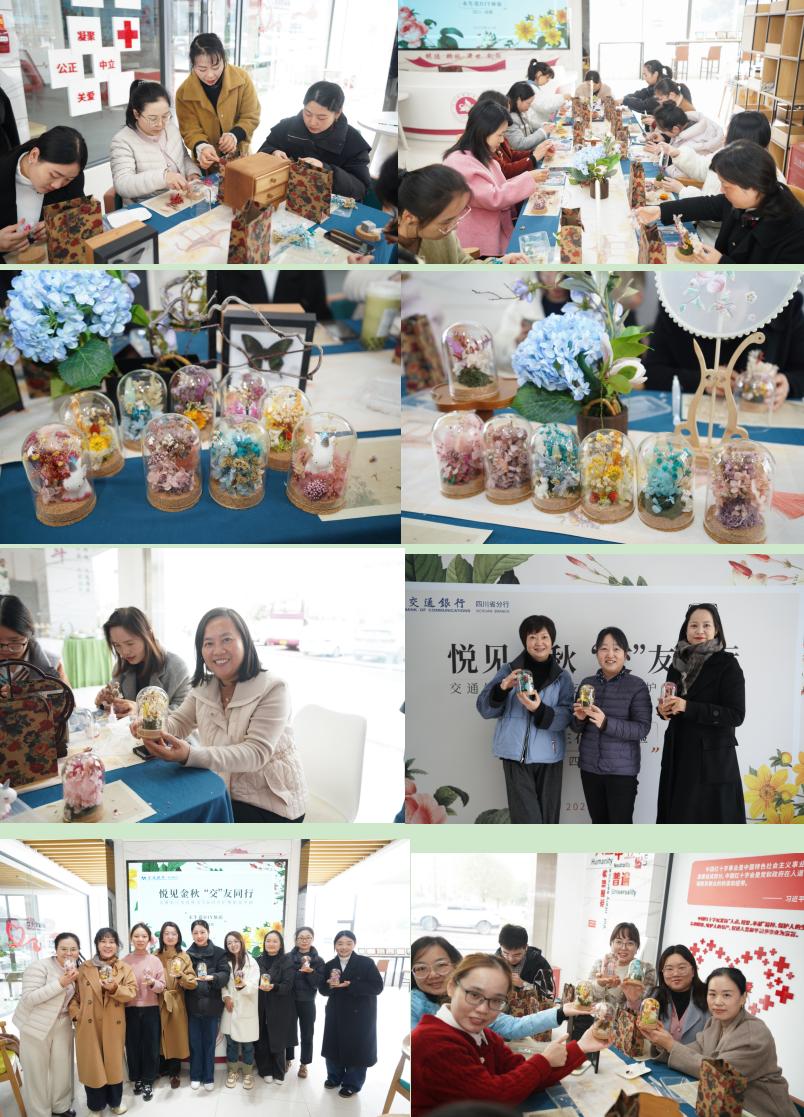 为弘扬劳动精神、工匠精神,坚定文化自信,丰富教职工精神文化生活,11月18日,由学校工会主办,交通银行龙泉驿支行协办、党群分工会承办的“悦见金秋‘交’友同行”永生花手工制作活动在成都校区举行,学院100余名教职工踊跃参与。