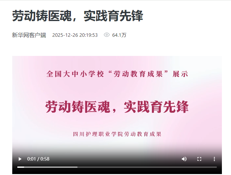 近日,由中宣部宣传舆情研究中心、“学习强国”学习平台及新华网联合发起的全国大中小学校“劳动教育成果”征集展示活动评选结果正式公布。学院《劳动铸医魂 实践育先锋》(CRC人才培养教师团队建设创新案例)劳动教育成果成功入选标杆案例,成为全国医药类院校劳动教育实践的优秀范例。截至发稿,该成果已在“学习强国”学习平台和新华网面向全国展播,播放量已突破64万次,赢得社会广泛关注与好评。
