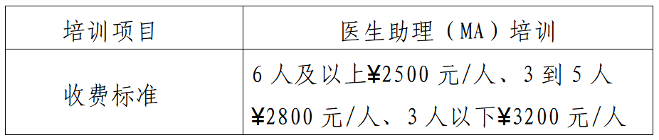 为缓解医疗资源短缺问题,提高患者就医满意度,使用现有资源创造价值,我院结合社会需求,本着自愿的原则,现面向各医疗机构、相关人员等举办医生助理(MA)培训,并制定收费标准公示如下: