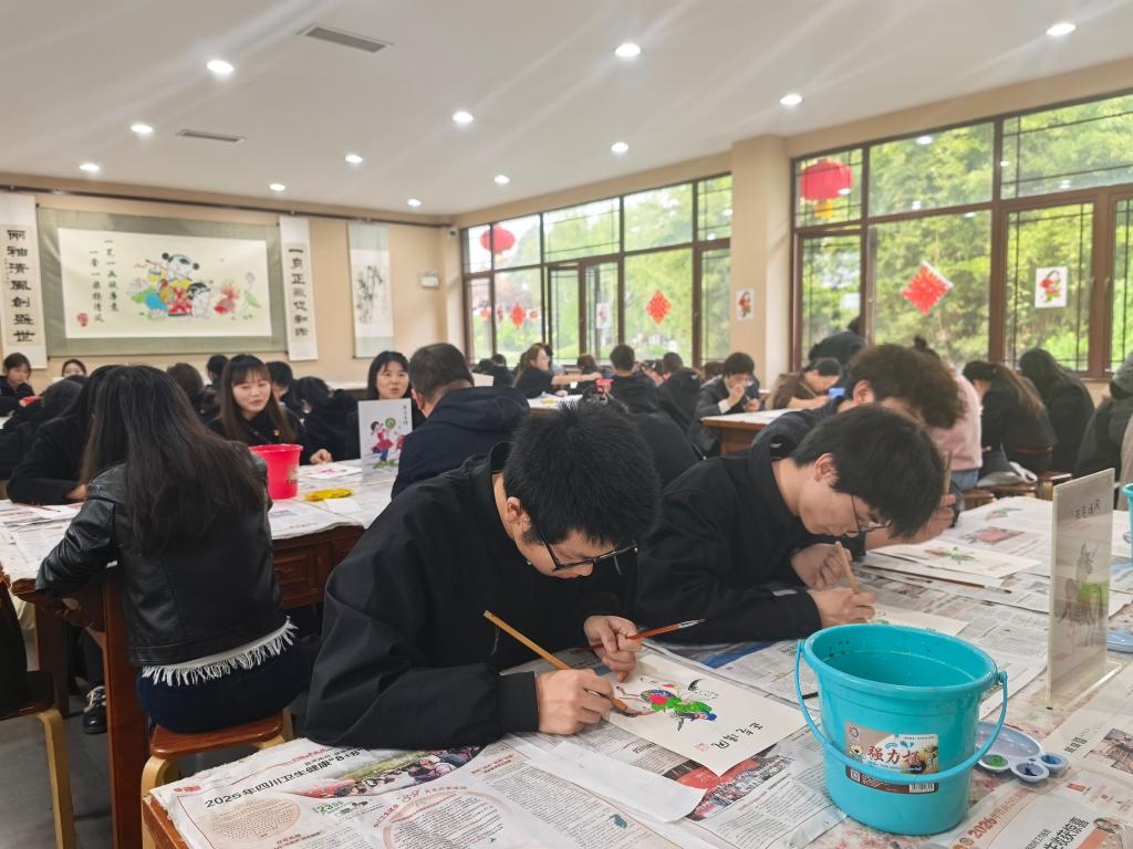 在非遗手工彩绘体验环节,师生们在非遗传承人的现场指导下,认真学习色彩调配、线条勾勒等技巧,全神贯注投入创作,亲手完成兼具传统韵味与个人特色的年画作品,沉浸式感受传统工艺的匠心与温度。