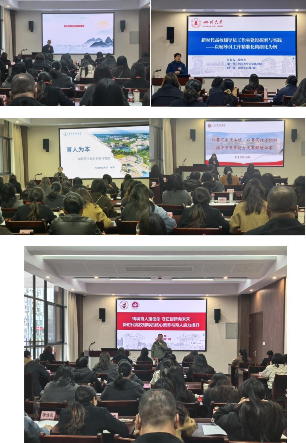 省委党校李绍华教授以《树立正确政绩观 践行立德树人使命》为题,从教育初心、责任担当出发,深刻阐释了新时代辅导员树立正确政绩观的核心要义与实践要求。成都中医药大学针灸推拿学院党委书记叶军教授结合优秀辅导员育人工作案例,全面梳理新时代辅导员应具备的核心素养体系,为辅导员自我提升提供参考路径。四川大学计算机学院(软件学院)党委副书记黎红友教授聚焦辅导员工作室建设,结合自身实践经验,详细讲解了工作室精准化定位、团队化建设、项目化运作的有效方法,为我校辅导员工作室提质增效提供了重要借鉴。全国“最美高校辅导员”、西南科技大学辛婷教授以《育人为本,辅导员工作的创新与实践》为题,围绕“泡菜坛”育人理念,分享其浸润式育人的实践探索与创新举措,展现了班团建设、劳动教育与思政育人的深度融合。我校康复学院专职辅导员杨颖则聚焦辅导员技能提升,结合全省高校辅导员素质能力大赛参赛经历,从政策理论储备、案例分析技巧、应急处置能力等方面进行细致拆解,为参训辅导员提升参赛能力、锤炼专业技能提供实战指引。